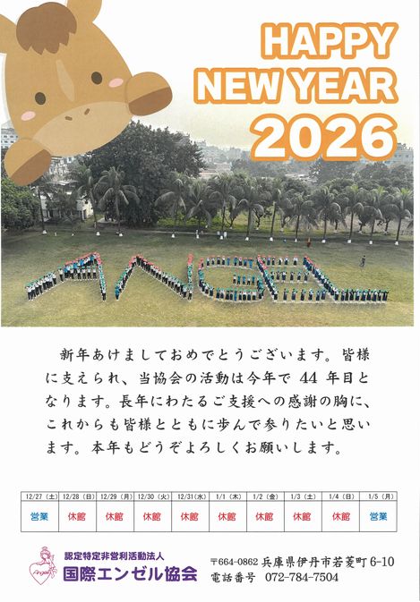 いつも国際エンゼル協会にご支援いただき、ありがとうございます。 誠に勝手ながら、下記の期間は年末年始休業とさせていただきます。 休業期間:2025年12月28日(日)〜2026年1月4日(日) 新年は 1月5日(月)より業務を再開いたします。 日頃より、国際エンゼル協会へご協力いただき誠にありがとうございます。